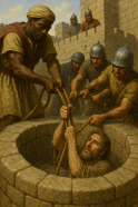 Jerusalemin päämiehet vihastuivat Jeremian viestiin ja käskivät heittää hänet kaivoon josta ystävät sitten pelastivat hänet! Jer, 38:1-13 LUE LISÄÄ Jeremian kirjan sisällöstä.
